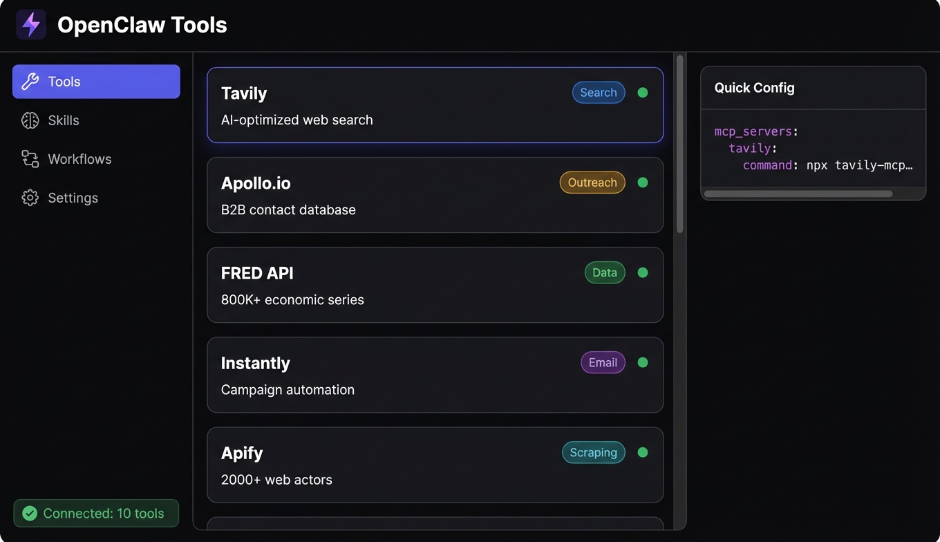 Many OpenClaw tools have generous free tiers. Tavily, FRED API, Census Bureau API, and Google Trends all offer free access suitable for development and moderate production use. Tools like Apollo.io, Instantly, and Apify have free tiers with usage limits and paid plans for higher volume. The MCP servers themselves (the connectors) are typically open-source — you pay for the underlying service API, not the integration layer.