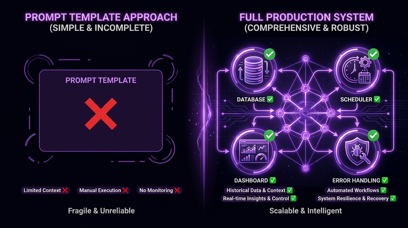 Prompt templates give you one turn of reasoning with no memory, no error handling, and no scheduling. Production agents need persistent state (databases to track prior runs), observability (dashboards and logs), error recovery (retry logic, circuit breakers), and automated scheduling. These are software engineering concerns that prompts alone can't solve.